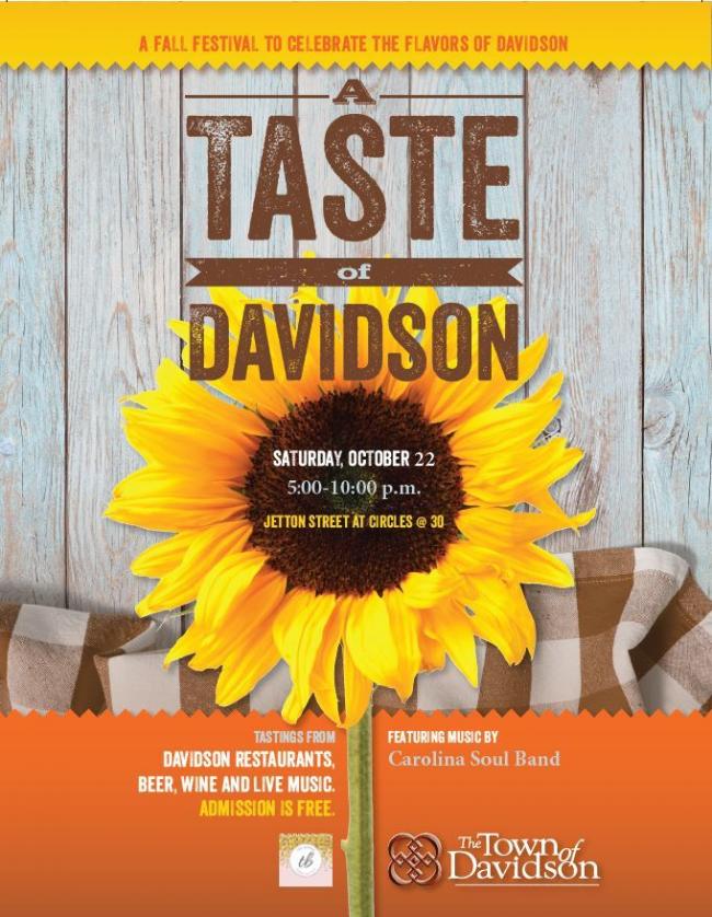 The Town of Davidson is pleased to present “A Taste of Davidson” on Saturday, October 22, 2022 from 5:00-10:00 p.m. This annual event is a fall festival to celebrate the flavors of Davidson and will feature food and beverages from our great restaurants as well as music by Carolina Soul Band.